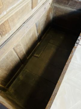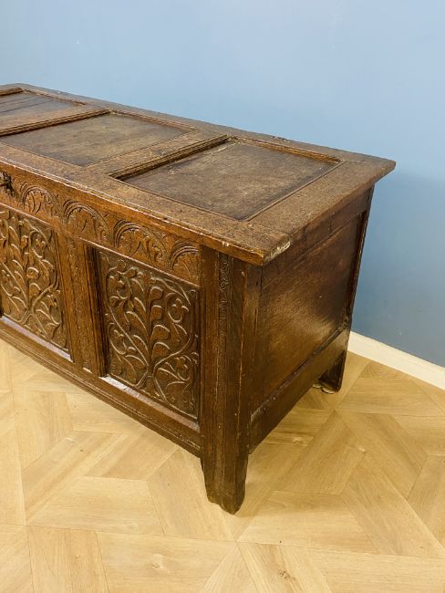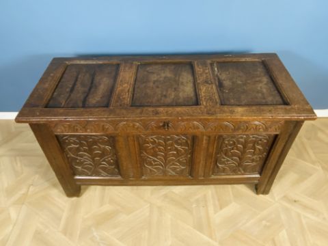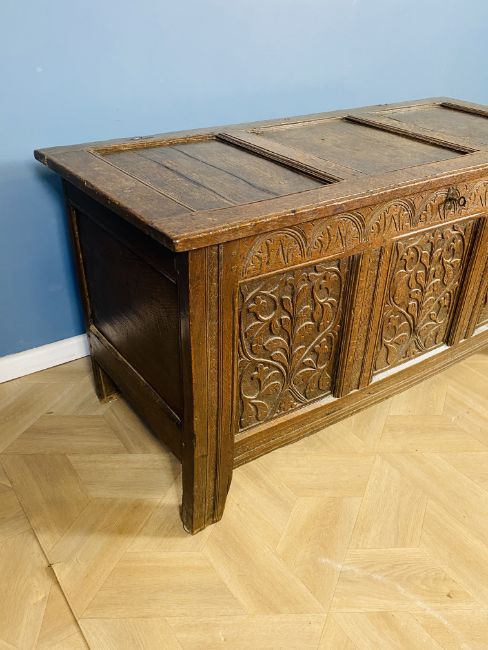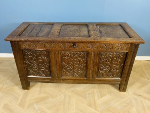 An 18th century oak coffer with a three panel top and carved front panels, original iron hinges and escutcheon, complete with key, 136.5cms wide x 58.5cms deep x 71cms high. Estimate £70-100.