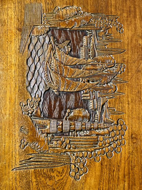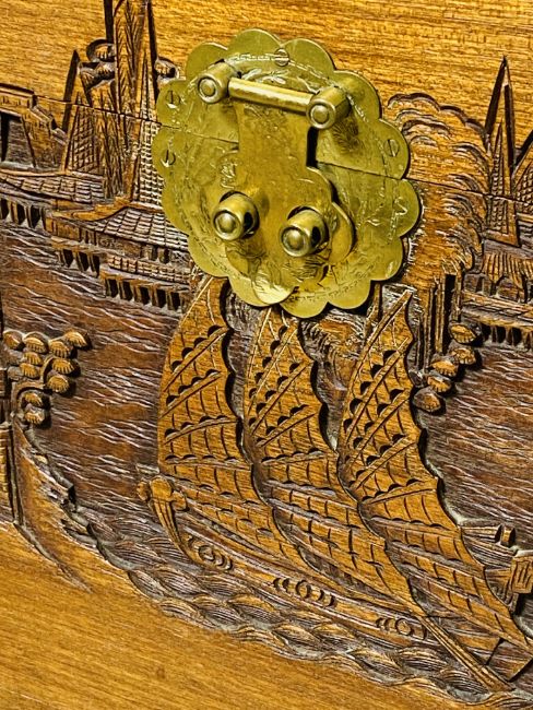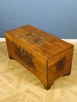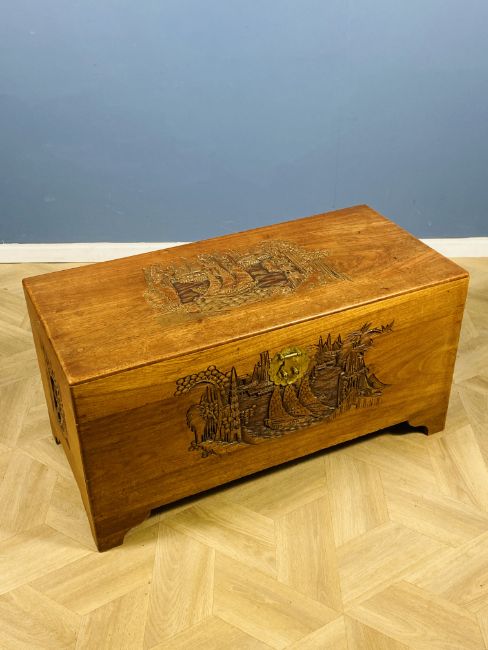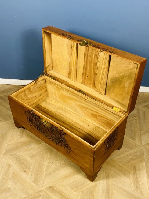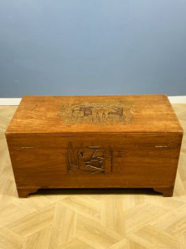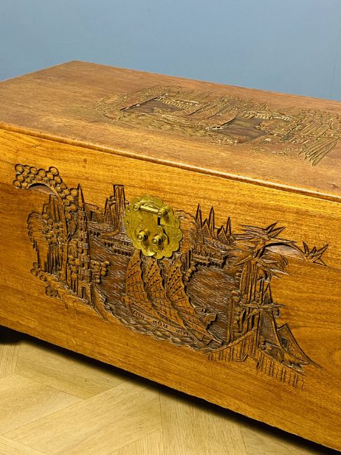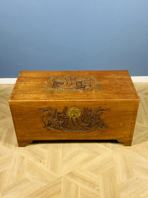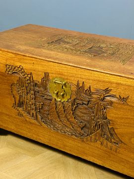 An Oriental camphor wood chest with a central brass locking plate and carved decoration throughout, 94.5cms wide x 45cms deep x 47cms high. Estimate £30-50.